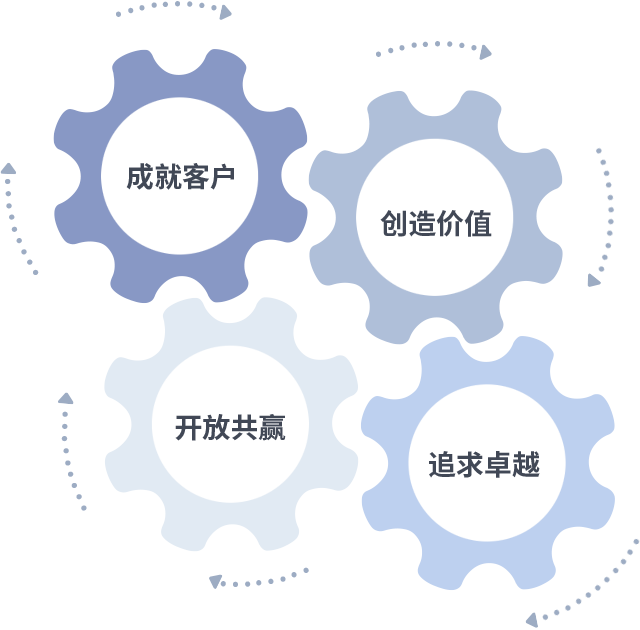 成就客户是一切决策的出发点,,,创造价值是衡量所有工作的标准,,,,追求卓越是我们做事做人的态度,,,,开放共赢是我们的格局也是最终的结果。。。价值观的齿轮环环相扣,,推动着组织里的每个人不断向前。。